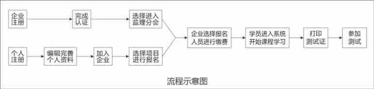 本次培训采用个人、企业网上注册和信息填报,企业统一报名缴费的方式进行。凡符合报名条件的人员和企业,可进入四川省建设工程质量安全与监理协会网站,登录报名系统(http://bm.cqssa.org.cn/)进行报名,流程如下图,详细操作步骤详见附件1。