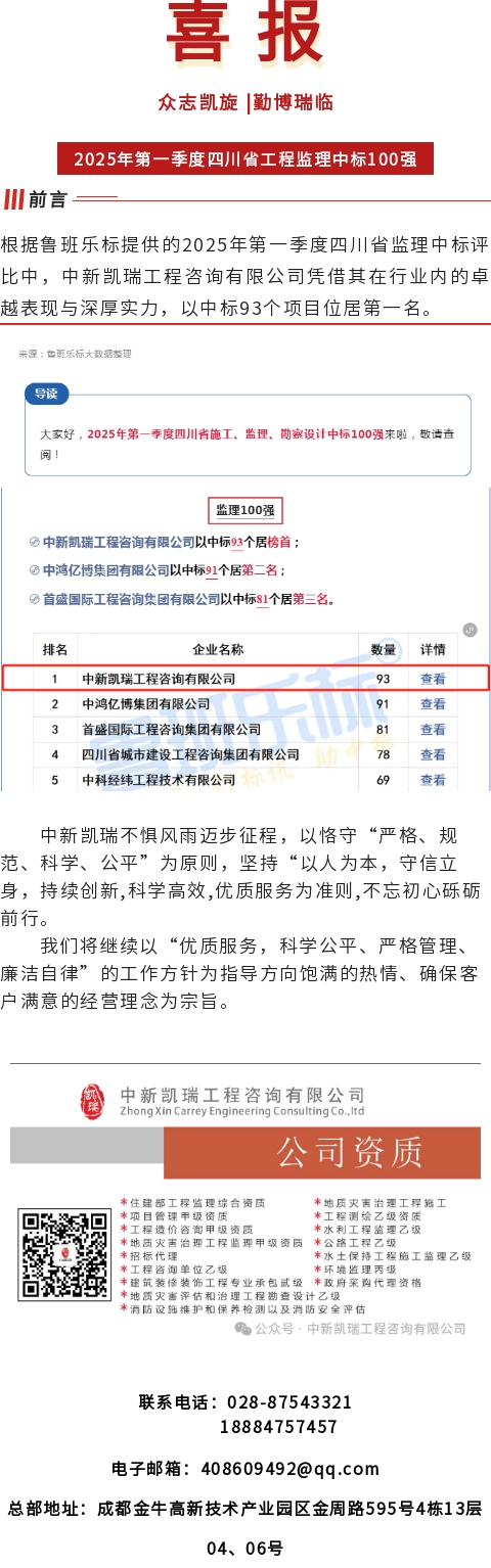 【喜报】2025年第一季度四川省工程监理100强,中新凯瑞位居第一名