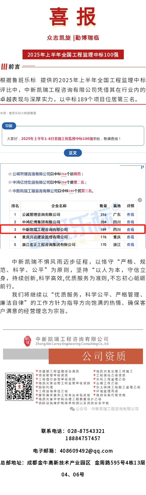 【动态】2025年上半年全国工程监理中标100强,中新凯瑞位居第三名