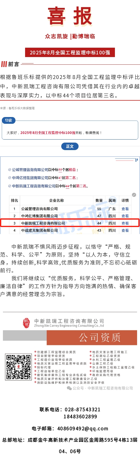 【喜报】2025年8月全国工程监理中标100强,中新凯瑞位居第三名