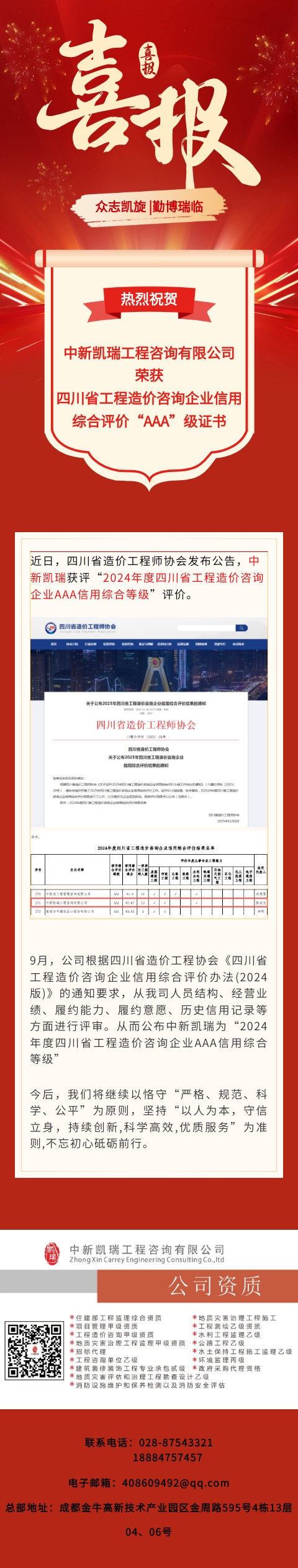 【喜报】中新凯瑞荣获“四川省工程造价咨询企业信用综合评价AAA级”证书